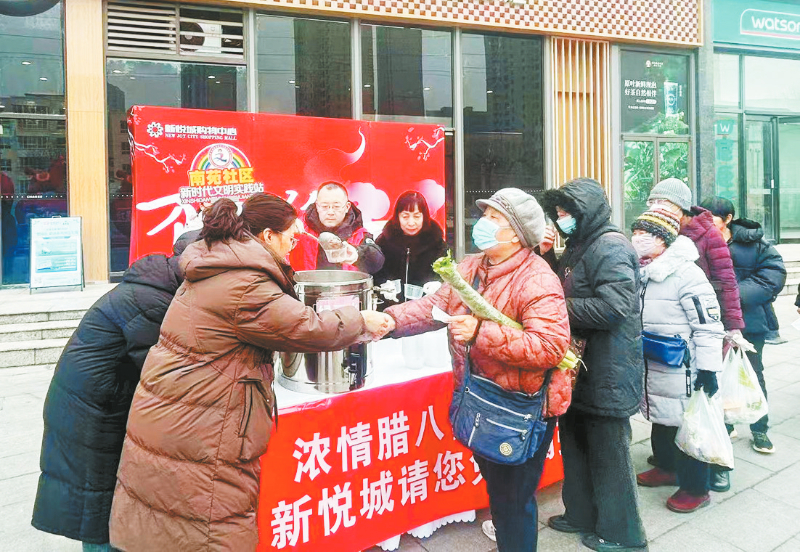 1月26日,红旗区向阳街道南苑社区与新悦城购物中心携手开展“浓情腊八、粥暖邻里”主题活动,为辖区居民和环卫工人送上热乎乎的八宝粥。(向宣)