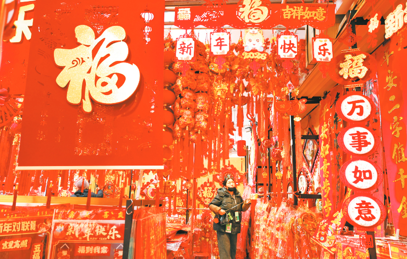 1月28日,店员在河北省石家庄市南三条年货批发市场整理年货饰品。春节临近,各地市场红火,众多市民备年货、赶市集,喜迎新春。 新华社发