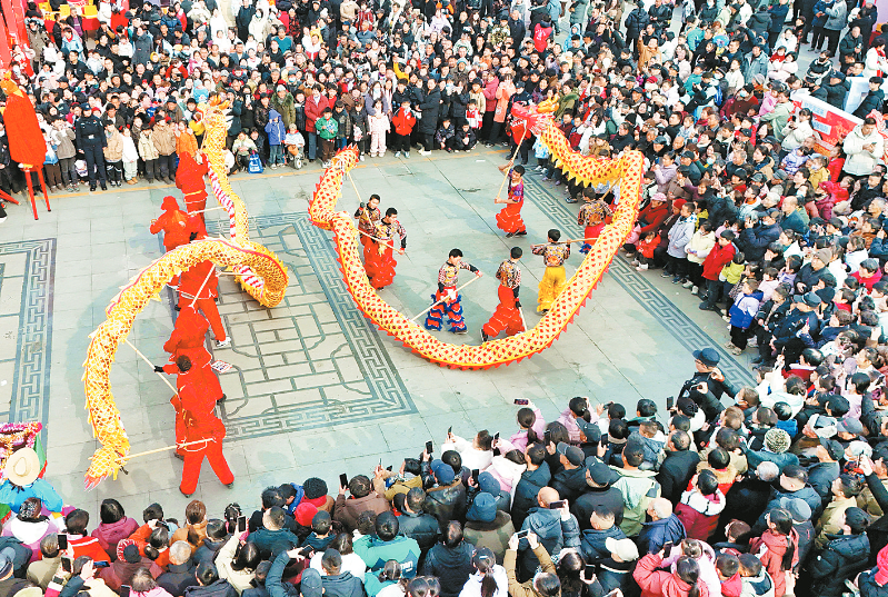 2月4日,在河南省南阳市内乡县衙博物馆,市民、游客在文化广场观看舞龙表演(无人机照片)。2月4日,恰逢立春节气,各地举办丰富多彩的活动,喜迎新春。