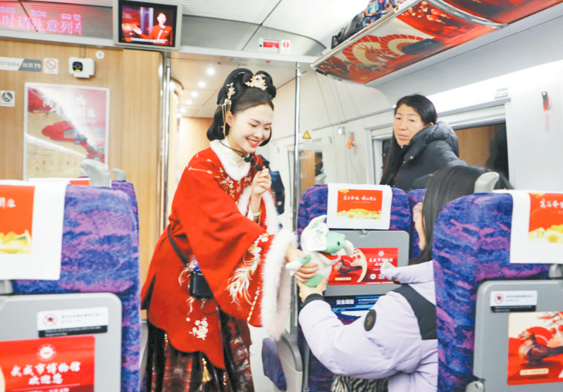 2月9日,在G848次列车上,武威市博物馆工作人员向旅客赠送文创礼品。