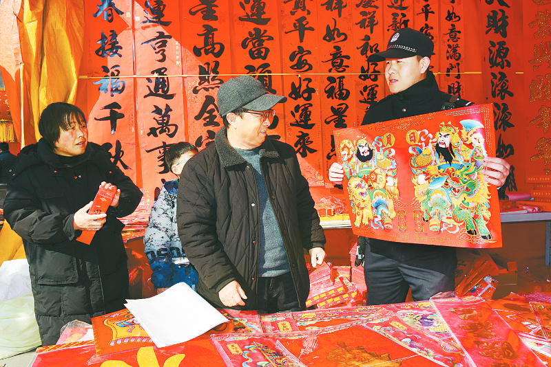经营年画生意20多年的刘先生边整理货品边向笔者说:“派出所民警年年都来汇金城年货大街,更多时候是提醒这提醒那。有他们在,我们做生意安心,老百姓买东西也放心。”