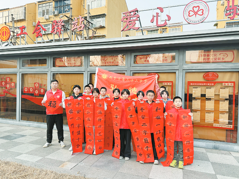 笔墨传福,春联寄情。学校书法社团师生与党员志愿者走进社区,开展“写春联·送祝福”活动。志愿者们铺展红纸、研磨挥毫,一副副笔力遒劲的春联,一个个寓意吉祥的“福”字新鲜出炉(如图)。