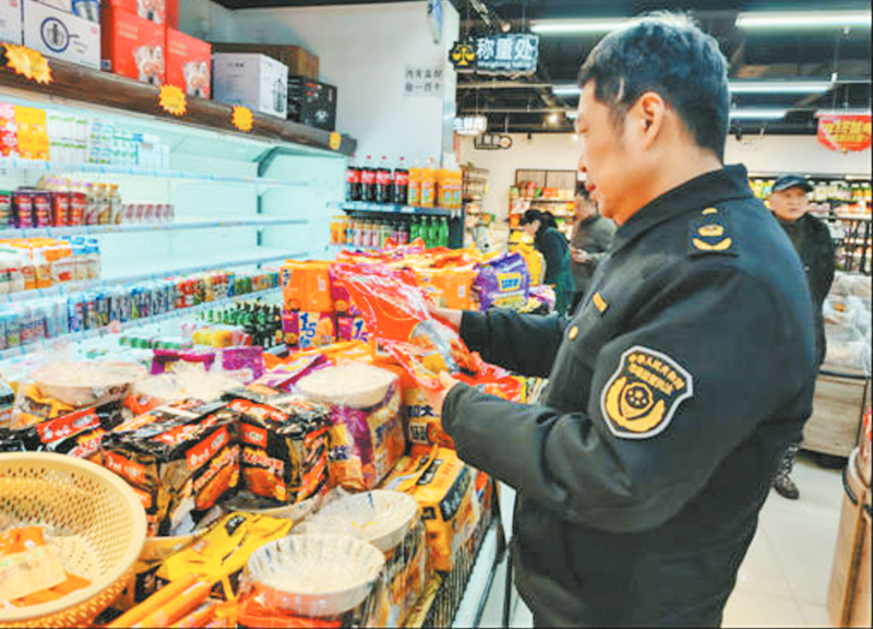 守好“舌尖安全”,让年味儿更有“鲜”味。春节期间是食品消费的高峰期,也是食品安全风险集中、问题易发的敏感时段。针对节日消费特点,执法人员深入大型商超、农贸市场、年夜饭供餐单位等重点场所,以米、面、粮、食用油、肉制品、水产品、乳制品等热销食品为重点,严查进货查验、索证索票、标签标识等环节(如图)。在集中聚餐单位后厨,执法人员重点排查食品储存、加工制作、餐饮用具清洗消毒等风险隐患,督促餐饮单位严格落实主体责任,坚决杜绝铺张浪费,确保群众“舌尖上的年味”既丰盛又安全。
