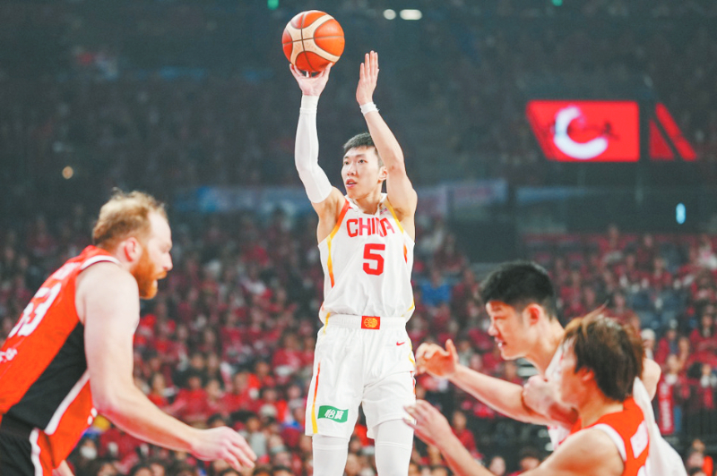2月26日,中国队球员廖三宁(中)在比赛中投篮。当地时间2月26日,在日本冲绳举行的2027年国际篮联篮球世界杯亚洲区预选赛第一阶段B组比赛中,中国队87比80战胜日本队。 新华社记者 贾浩成 摄