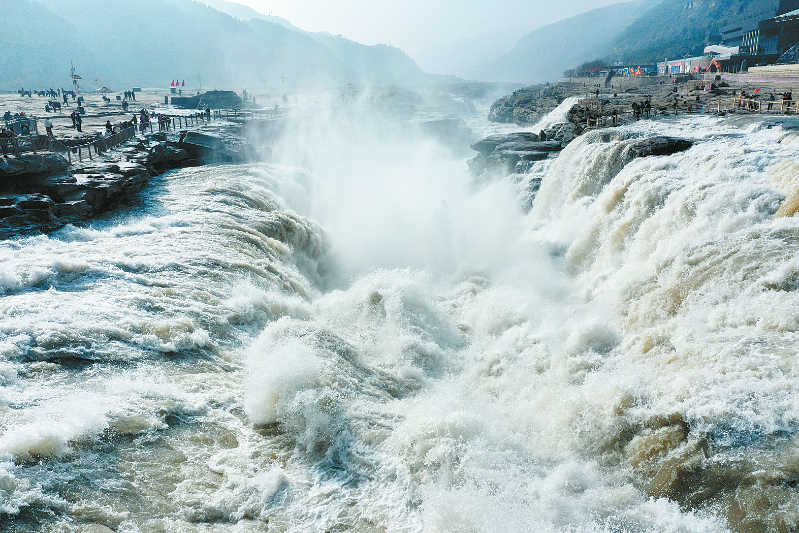 惊蛰时节,随着气温回暖,黄河上游河段融冰开河速度加快,壶口瀑布水量增大。