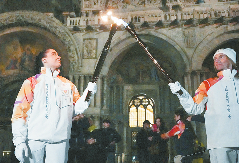 3月4日,火炬手彼得(右)与火炬手维拉在威尼斯圣马可大教堂前进行火炬交接。当地时间3月4日,米兰-科尔蒂纳冬残奥会火炬传递在意大利威尼斯举行。