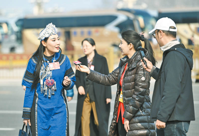 3月8日,全国政协十四届四次会议在北京人民大会堂举行第三次全体会议。这是记者在采访全国政协委员。