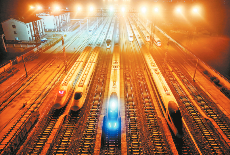 3月13日,动车组列车在江苏省连云港站等待发车(无人机照片)。