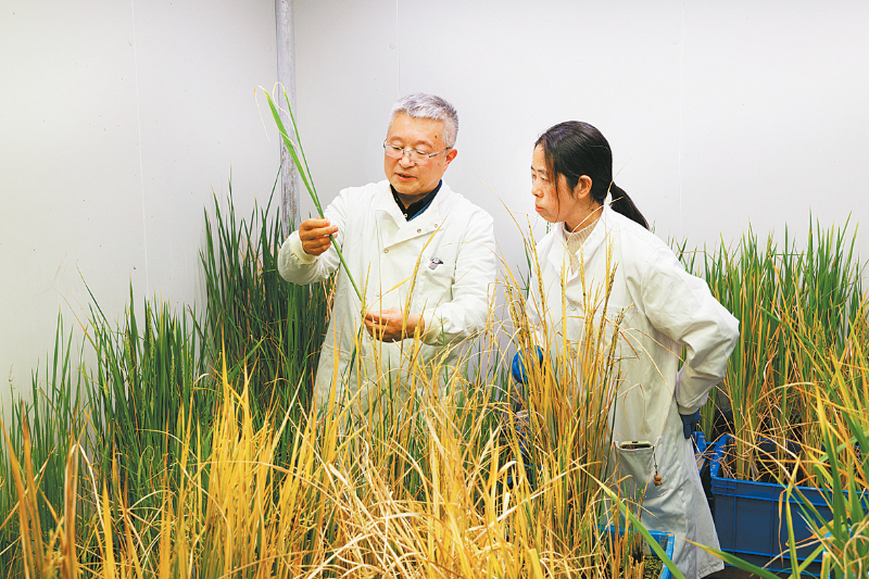 3月18日,在中国科学院分子植物科学卓越创新中心温室,韩斌院士(左)和吕丹凤高级工程师在交流水稻植株生长情况。