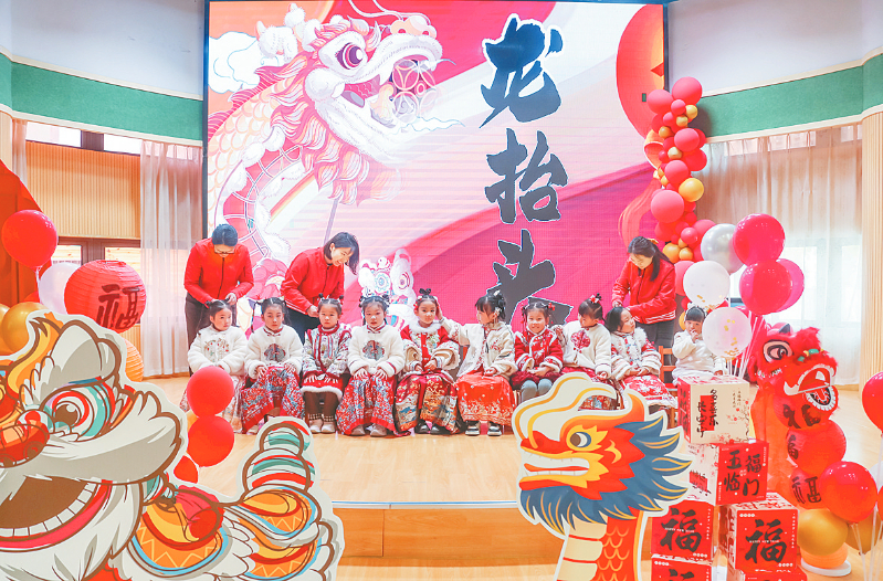 3月20日,在江苏省句容市北部新城幼儿园“二月二,龙抬头”主题活动中,老师为小朋友们“梳龙头”“扎龙辫”。