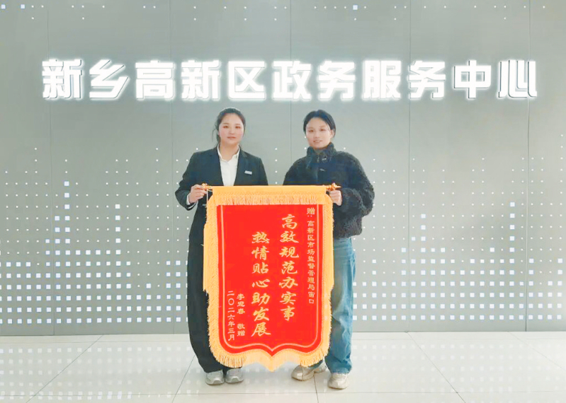本报讯 3月18日,新乡市嘉元医药有限公司负责人李女士专程来到高新区政务服务中心市场监管分局窗口,将一面印有“高效规范办实事、热情贴心助发展”字样的锦旗送到窗口工作人员手中,对窗口工作人员全程指导、帮办代办药品经营许可业务表示衷心感谢(如图)。