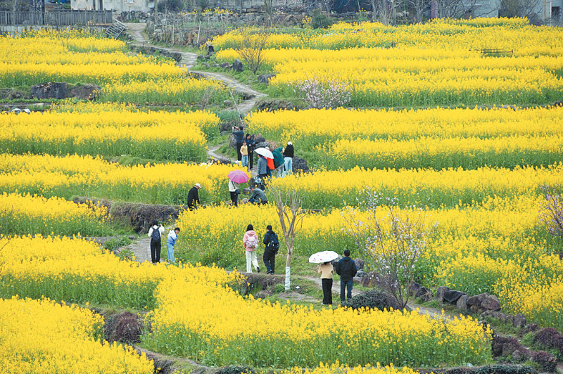 眼下,安徽省宣城市绩溪县家朋乡幸福村的油菜花田进入盛花期,大批游客来此踏青赏花。