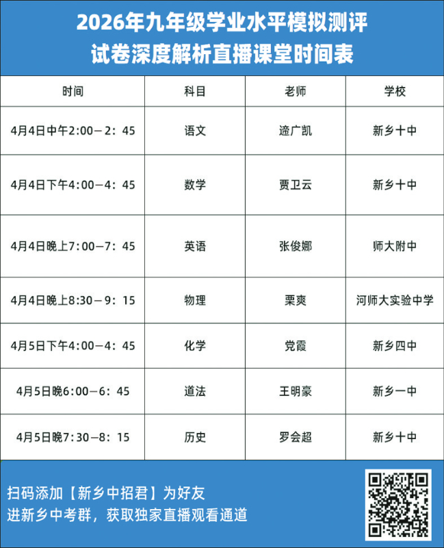 在这关键的节点,如何让一张试卷的价值最大化?如何透过分数看到背后的命题逻辑与知识短板?新乡日报社教育周刊携名师公益直播,将于4月4日、5日重磅推出“新乡顶尖名师团,深度拆解学业水平模拟测评,传授提分秘籍”——2026年九年级学业水平模拟测评试卷深度解析直播课堂。这不仅是一场公益性的知识盛宴,更是一次集结全城顶尖名师,为九年级学子量身定制的冲刺指南。