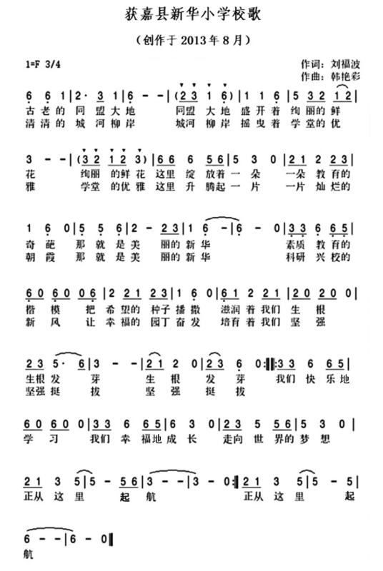 校歌是校园文化的重要组成部分,是一所学校优良校风的高度概括。为提高师生凝聚力,增强师生归属感,丰富学校文化内涵,2013年,获嘉县新华小学根据学校地理位置,结合办学历史,融合教育理念,几经商讨,最终创作出这首好听、易唱、简洁明快的校歌。它如学校的精神图腾,与校徽、校训相辅相成,在激励学生成长、凝聚学校精神、提升学校品位等方面发挥着不可替代的作用。