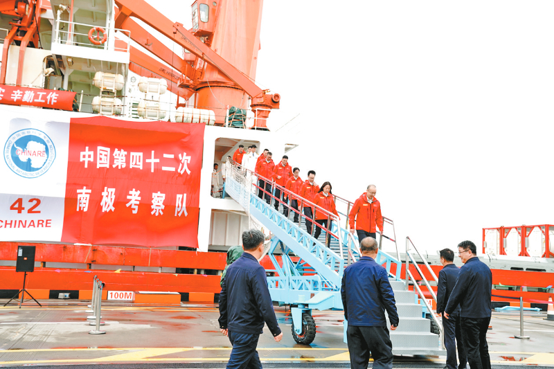4月9日,中国第42次南极考察队队员走下“雪龙”号。