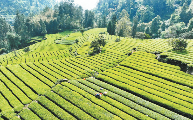 4月9日,湖北省宣恩县椒园镇中坝社区的茶农在采摘春茶(无人机照片)。人勤春来早。春日里,人们翻耕整地、育苗管护、播种施肥、采摘新茶,在田野中忙碌,勾勒出生机盎然的农耕画卷。