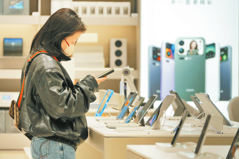 4月10日,消费者在山东省烟台市一家商场选购电子产品。