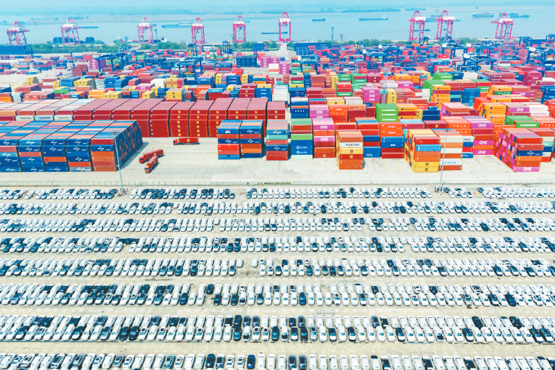 这是4月10日在江苏省港口集团南京港龙潭港片区拍摄的等待远销的汽车(无人机照片)。