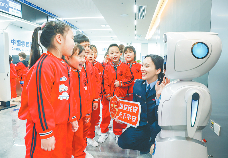 4月13日,在江苏省扬州市公安局江都分局出入境管理大队,扬州市江都区一幼儿园小朋友通过与机器人对话了解出入境安全知识。