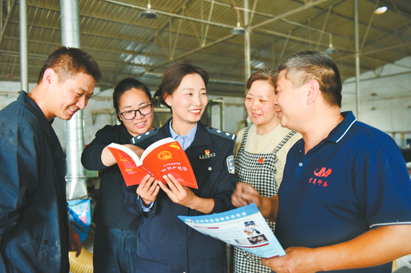 为增强辖区企业知识产权保护意识,提升企业知识产权风险防范和依法维权能力,近日,市公安局卫滨分局平原派出所组织民警走进辖区某印刷企业,开展“知识产权宣传进企业”活动,将法律知识和维权服务送到企业生产一线。图为民警为企业员工讲解知识产权相关法规。