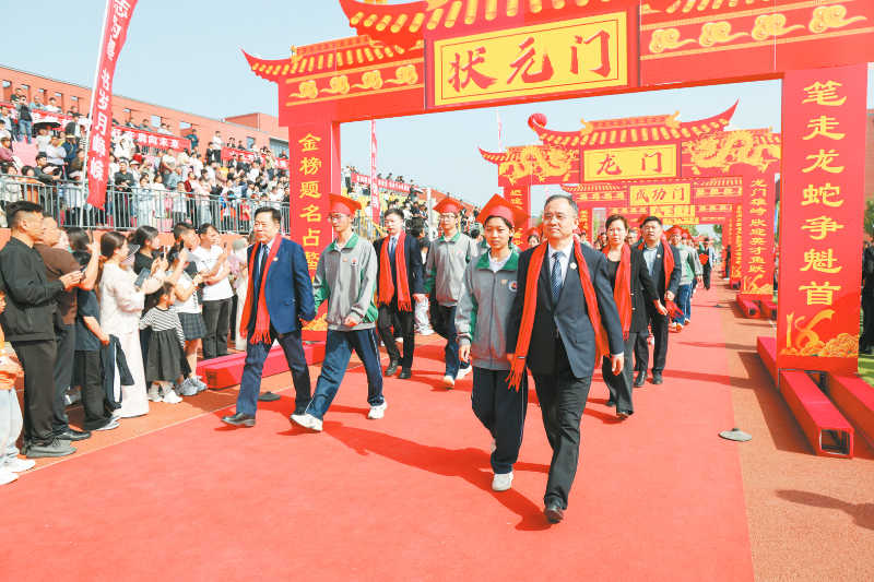十八响礼炮轰鸣,象征着十八岁的正式到来,刘方和曹荣旺共同剪彩,随后领导、家长携手学子,按班级顺序昂首依次通过“成人门”“成才门”“成功门”“龙门”“状元门”(如图)。一步一成长,一门一新生,跨过大门,意味着学子们正式告别少年时代,肩负起成年公民的责任与担当。